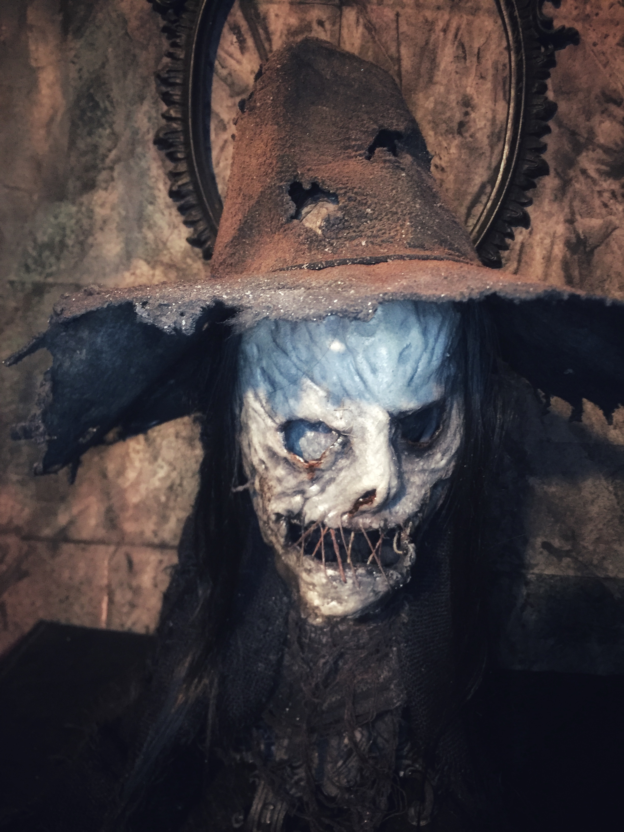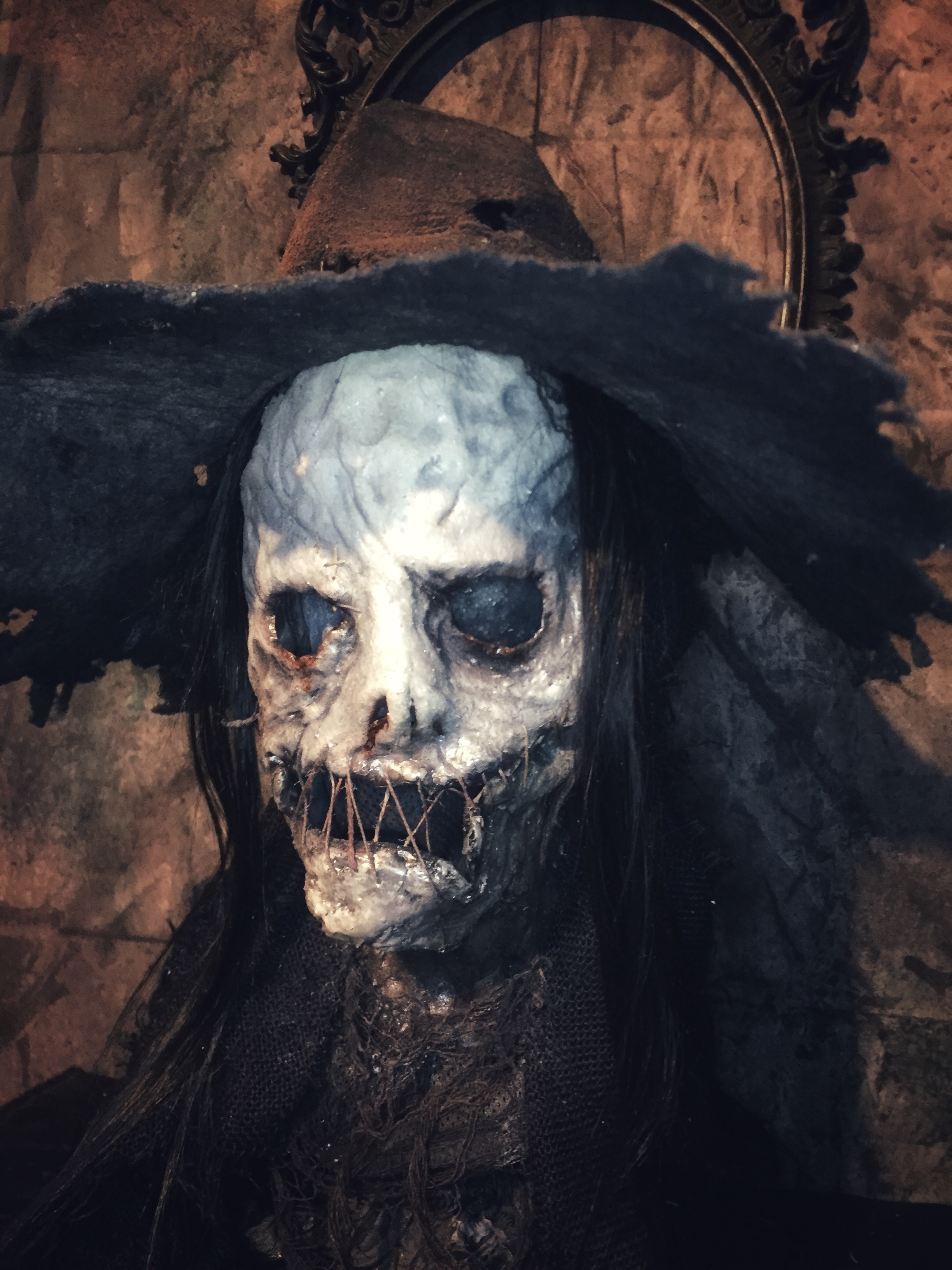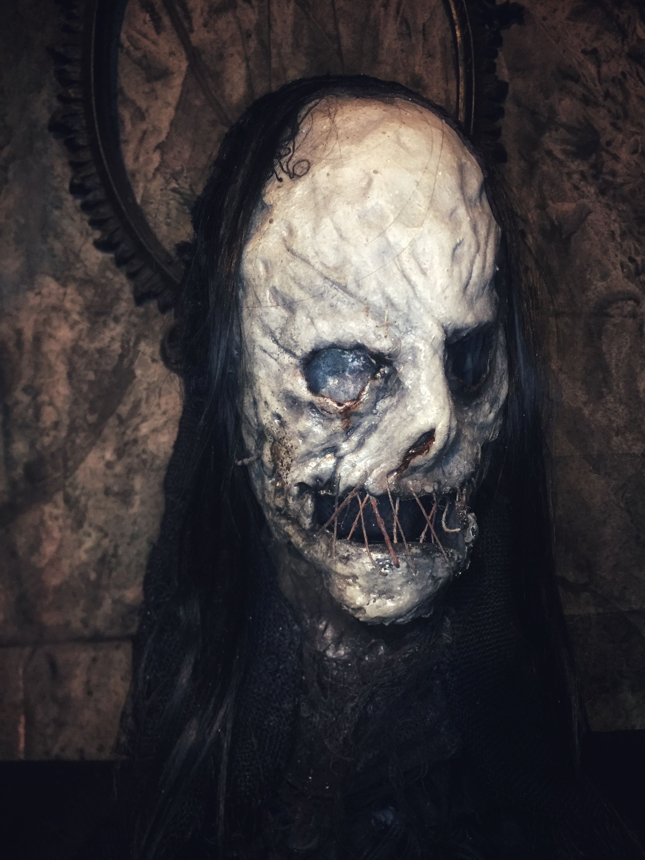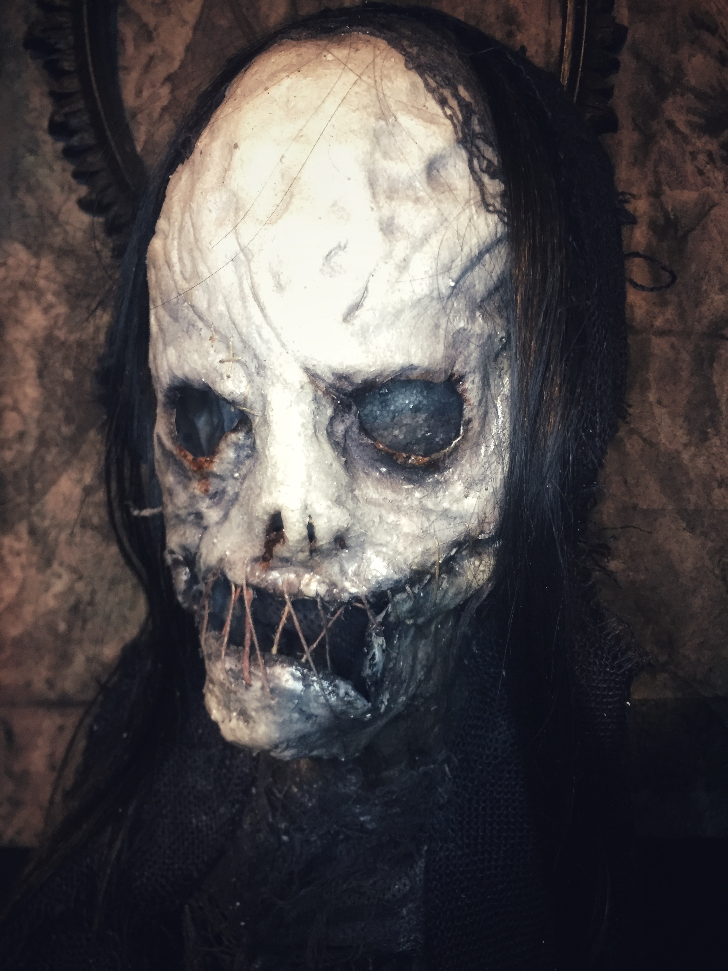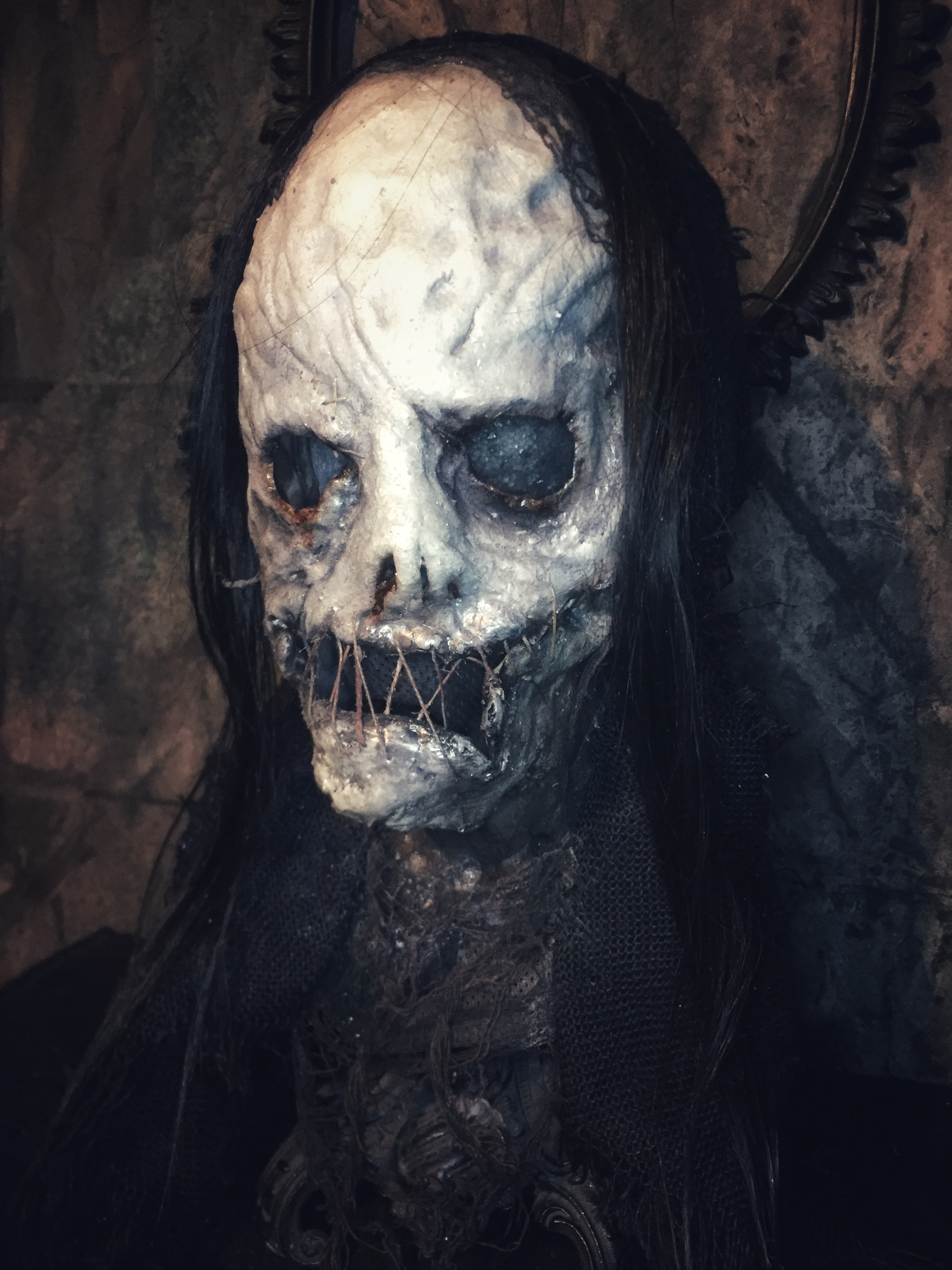 Half mask attached to a spandex hood then overlayed with black burlap and other fabric. Hand stitching. Complete the look with one of our hats or hoods sold separately